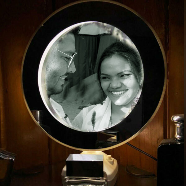 This Magical Mirror is circular in shape and its diameter is 20 cm which fits the photo. This Magical Mirror will turn into Photo Frame when you press the round switch and also it connects will electricity. If you plug this into the socket, the mirror will dim with LED lights. It is also used as a Lamp at night times. You can connect this through a USB cable which will be provided by us only. Once the cable is connected, it will start to glow, when it’s switched off it will convert into a Mirror. It can be used by batteries also.